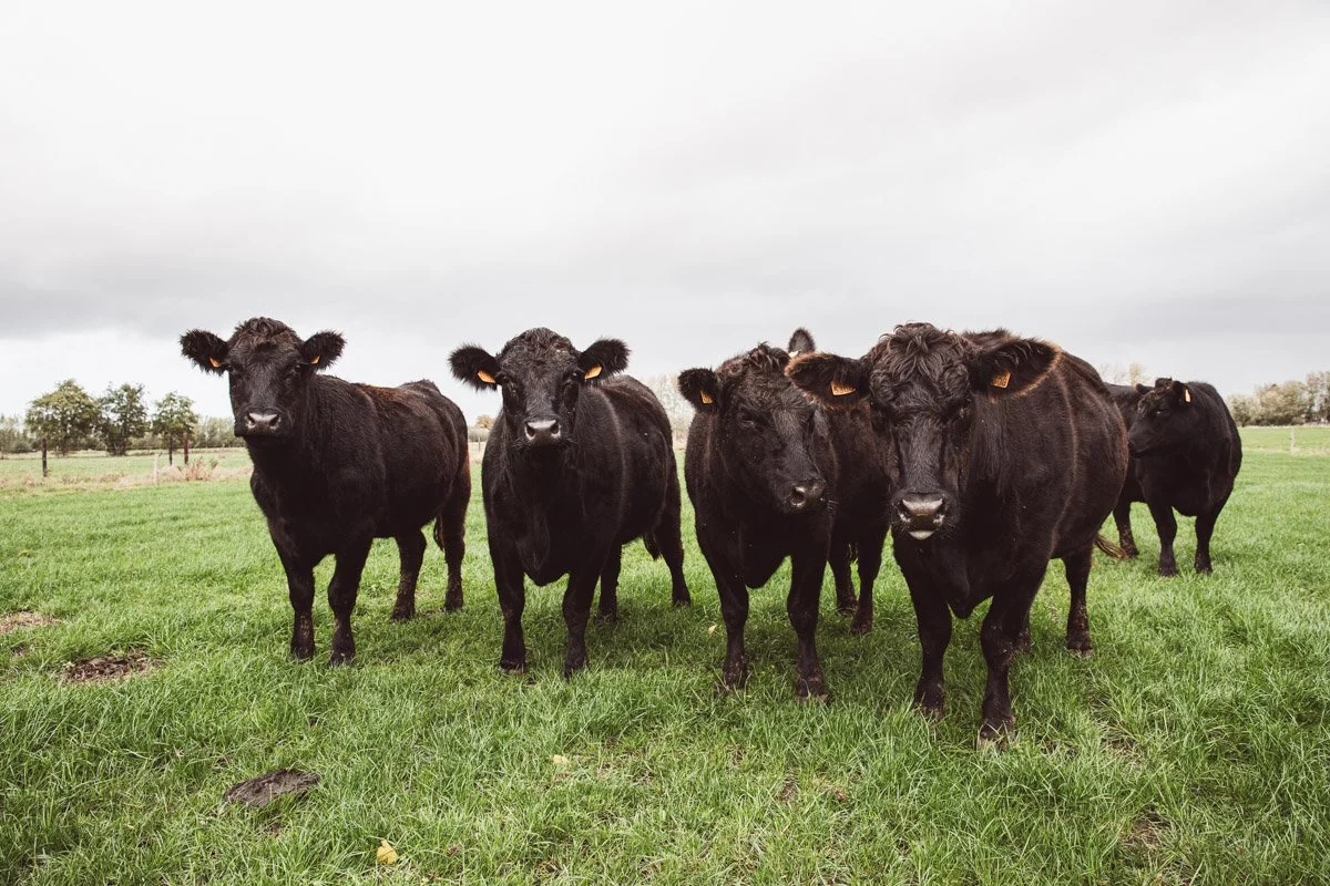 Onze Black Angus-runderen grazen buiten in alle rust, op groene weiden temidden van het Meetjesland.